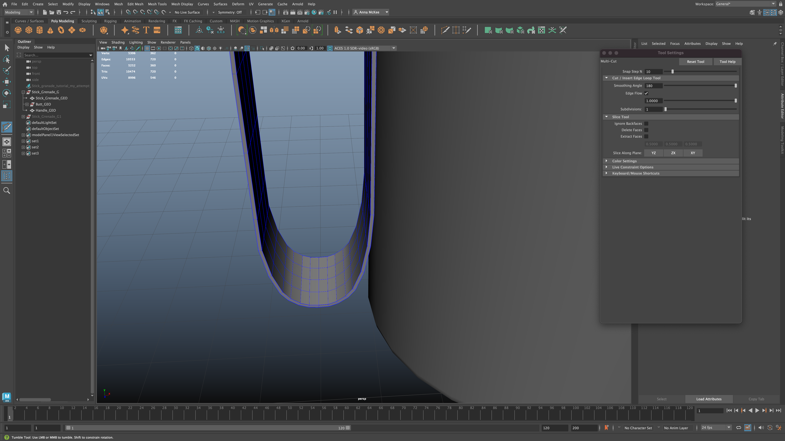 After much discussion with my peers regarding this issue, they encouraged me to proceed with the “Stick Grenade” tutorial as they themselves felt that it was simple, concise and continuously expanded on fundamentals within the hard-surface modelling process in Maya, (ie, Extrude, Bevel, Scale).